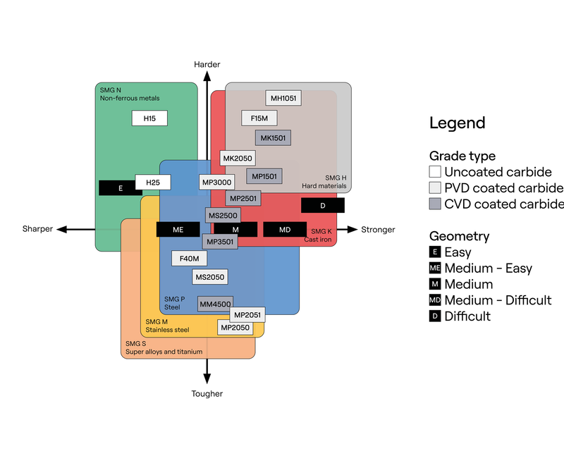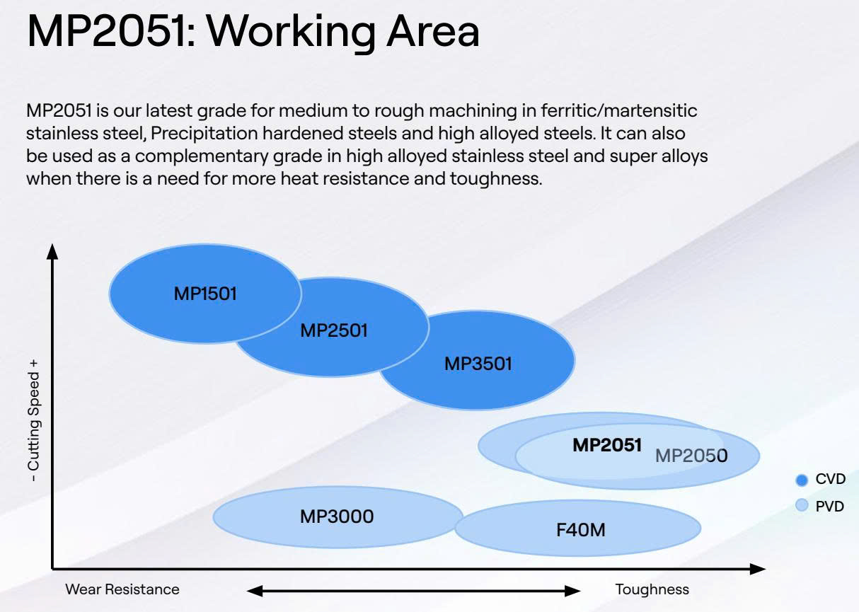 MP2051 được tối ưu hóa cho gia công trung bình đến thô (medium to rough machining) và mang lại hiệu suất nhất quán trên nhiều loại vật liệu: