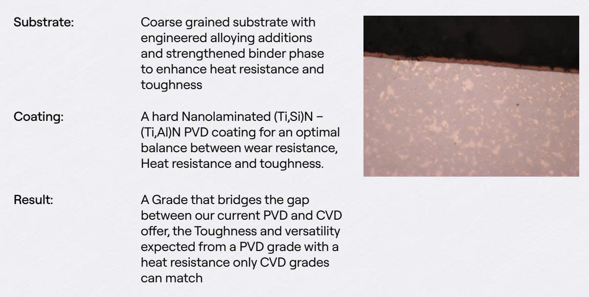 Lớp phủ (Coating): Lớp phủ PVD Nanolaminated (Ti, Si)N - (Ti,Al)N cứng , đạt sự cân bằng tối ưu giữa chống mài mòn, chịu nhiệt và độ dẻo dai.